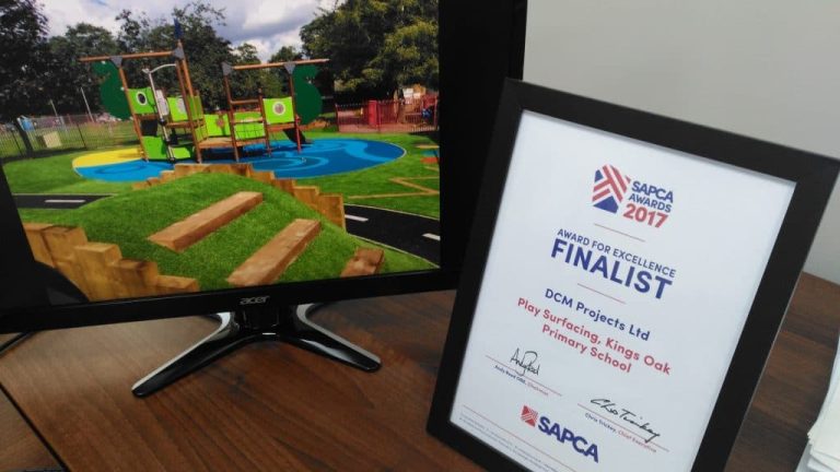 The Annual Awards Programme is held in order to recognise members’ achievements and to promote the best examples of outstanding quality. DCM entered the Awards with Kings Oak Primary School. Spread over four play areas, eight colours of wet pour and two colours of rubber mulch was used to create a variety of graphics and shapes, including a roadway with markings, leaf designs and intricate patterns around the play equipment area.