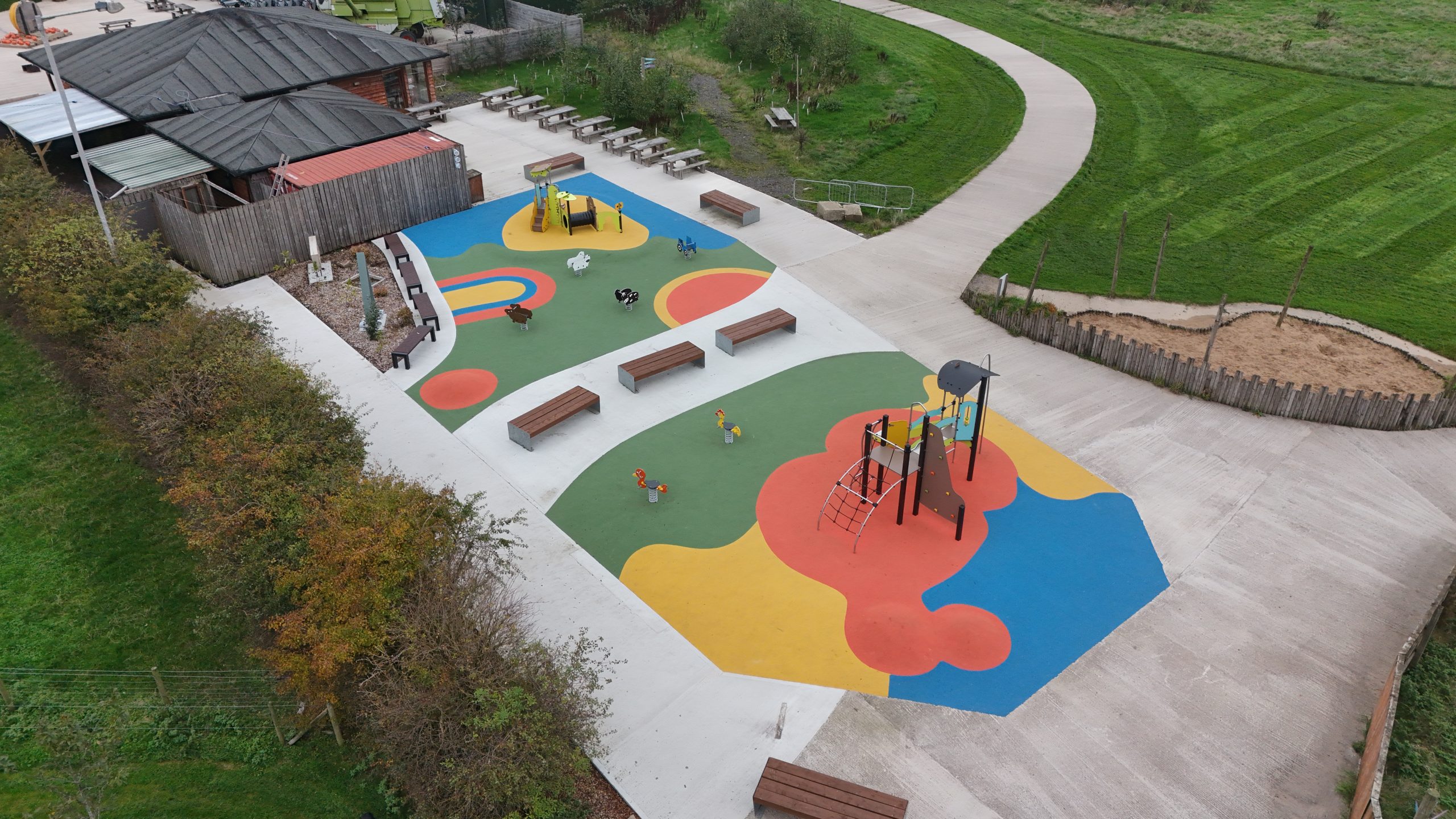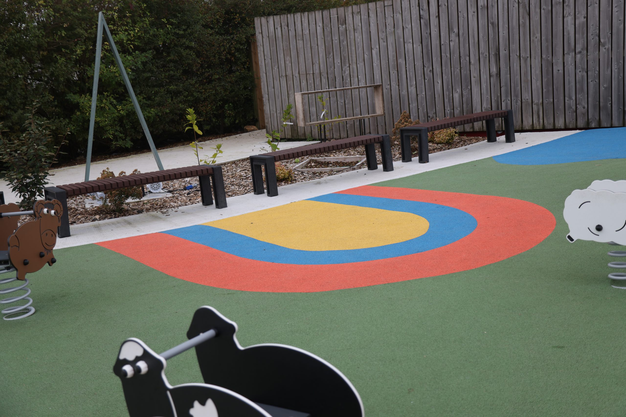 • Play Area 1 featured wetpour in a vibrant combination of orange, bright yellow, light green, and light blue, creating an eye-catching, playful environment.